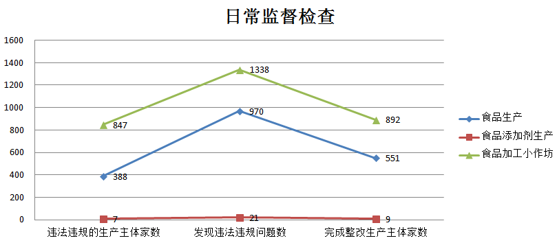 日常监督检查中发现违法违规的生产主体数1242家次,其中食品生产企业388家次,食品添加剂生产企业7家次,食品加工小作坊847家次;发现违法违规问题数2329个,其中食品生产企业970个,食品添加剂生产企业21个,食品加工小作坊1338个;完成整改生产主体数1452家次,其中食品生产企业551家次,食品添加剂生产企业9家次,食品加工小作坊892家次。