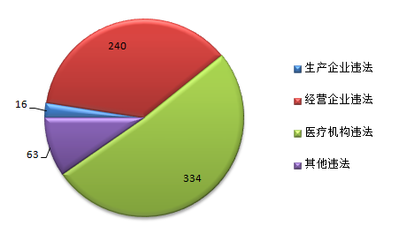 图6-2-1 2017年全省J9九游会娱乐案件查处情况分布图 从违法主体看,生产企业违法16件,经营企业违法240件,医疗机构违法334件,其他违法63件。