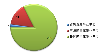 图1-1-1 2017年全省食品药品行政机构分布图 行政机构中,成都数量最多,共23个;资阳数量较少,为4个。副省级行政监管机构1个,成都局;市州级行政监管机构20个,除成都外各地分别一个。全省共有县区级行政监管机构195个,成都最多,22个;最少的资阳仅3个。 事业单位中,凉山最多,共63个;攀枝花最少,仅5个。副省级市下辖事业单位共3个,均为成都市;其余20个市州共下辖57个事业单位。全省共有县区级食品药品监管事业机构320个。 (二)事业单位各级食品药品监管事业单位总数281个,其中,省局直属事业单位6个,市州局直属事业单位43个,县区局直属事业单位230个。